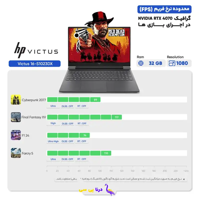 با پردازنده قدرتمند AMD Ryzen 7 8845HS و تراشه گرافیکی RTX 4070، لپ‌تاپ اچ‌پی Victus 16 قادر به اجرای بازی‌های مدرن با تنظیمات بالا و نرخ فریم مناسب است. در تست‌های مختلف، این لپ‌تاپ توانسته است بازی‌هایی مانند Cyberpunk 2077 را روی پریست Ultra با نرخ ۸۹ فریم در ثانیه اجرا کند. در بازی‌های دیگری مانند Final Fantasy XV و F1 24 نیز با تنظیمات High و Ultra High، نرخ فریم‌های بالایی را ثبت کرده است. نمایشگر پرسرعت ۱۴۴ هرتز و تکنولوژی‌های G-Sync، تجربه‌ای روان و بدون لگ را در بازی‌های سریع و رقابتی فراهم می‌آورد. عملکرد پردازشی قدرتمند پردازنده و کارت گرافیک، اجرای هم‌زمان چندین برنامه و بازی‌های سنگین را بدون افت عملکرد ممکن می‌سازد.