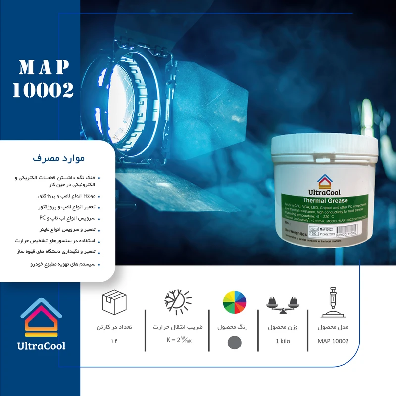 خمیر سیلیکون یا خمیر حرارتی UltraCool مدل MAP10002 رابط انتقال حرارت از روی انواع چیپ های ال ای دی نوری , الکترونیکی و کامپیوتری به روی خنک کننده (heat sink) است. توسط این خمیر گرما میان چیپ و هیت سینک جابجا شده و باعث کارکرد بهتر چیپ می شود. این خمیر زمانیکه بر روی پردازنده یا هیتسینک شما قرار میگیرد کلیه فضاهای خالی میکروسکوپی که بر روی پردازنده یا هیتسینک شما قرار دارد را پر میکند، زیرا هوا رسانای ضعیفی برای گرماست و این فضاهای خالی باعث عدم انتقال درست گرما و درنتیجه عملکرد ضعیف سیستم خنک کننده میشوند. خمیر سیلیکون یک رسانای گرمایی بسیار خوب است و در اینجا به عنوان رابط حرارتی عمل میکند و تا صد برابر هوا قادر است گرما را منتقل کند.
