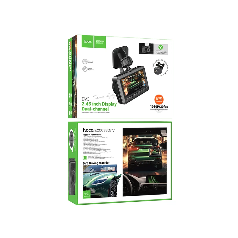 دوربین ثبت وقایع خودرو هوکو مدل DV3 ظرفیت باتری 200 میلی آمپر ساعت پشتیبانی از کارت حافظه تا 128 گیگابایت کلاس 10 نوع پردازنده GC2053 نوع سنسور JL5601A دارای ورودی تایپ سی با شدت جریان 5V/1.5 A و طول کابل 3.5 متر طول کابل: 5.5 متر پشتیبانی از 22 زبان: چینی، انگلیسی، روسی، عربی، دانمارکی، تایلندی، لهستانی، فارسی، اسپانیایی، مالایی، یونانی، فرانسوی، ایتالیایی، آلمانی، پرتغالی، ترکی، لاتین، رومانیایی، عبری، برمه ای، اوکراینی، ویتنامی دیافراگم F2.0 دارای لنز عریض ( واید ) 140 درجه ای دوربین دنده عقب این محصول HD دارای سنسور دید در شب وضوح فیلم 1080P@30FPS 2 میلیون پیکسل صفحه نمایش 2,2.45 اینچی IPS HD ضبط رانندگی با وضوح بالای IPS وضوح صفحه نمایش 240×432 کنترل اصلی: سنسور JL5601A GC2053 سایز : 70.5 x 48.3 x 35.8 میلی متر دوربین عقب 720P دارای گواهینامه QC PASS جهت تایید بررسی و آزمون های کیفیت سنجی دارای تمام استانداردهای بین المللی