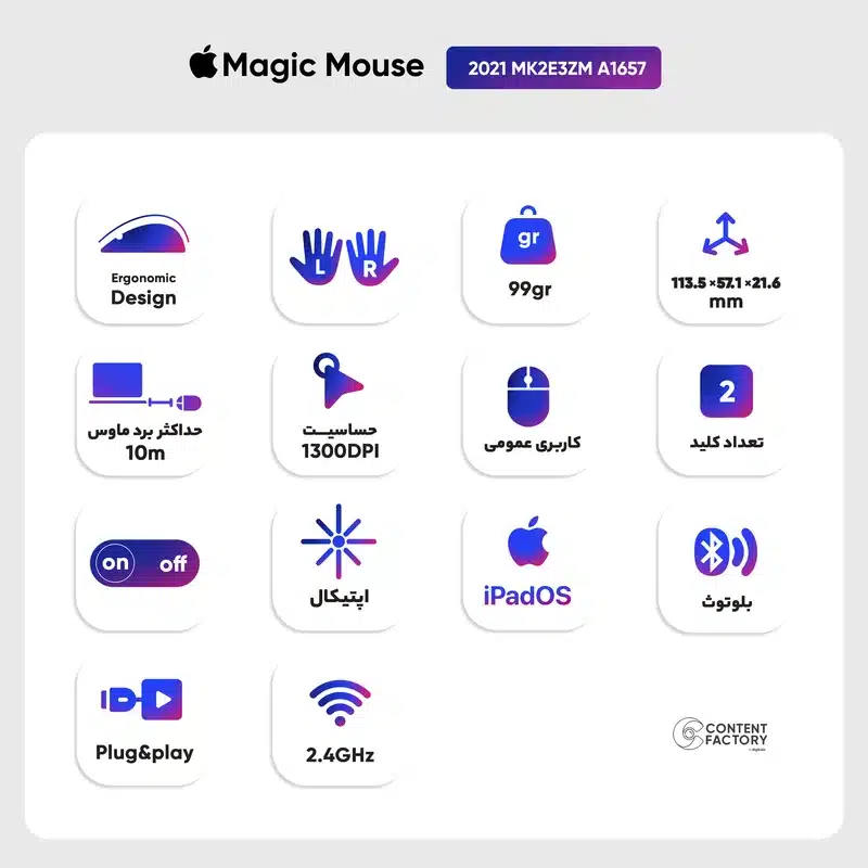 ماوس دارای سطح لمسی است که به شما امکان میدهد میانبرهای مختلف را تعریف کنید و با حرکات لمسی مختلف، عملکرد ماوس را سفارشی کنید. ماوس Magic Mouse 2021 با قابلیت مالتی تاچ، به شما اجازه میدهد با حرکات لمسی متنوع، اقدامات مختلفی را از جمله اسکرول، زوم، جابجایی بین صفحات و نرمافزارها و موارد دیگر انجام دهید. این ماوس از نوع حسگر لیزری استفاده میکند که دقت و حساسیت بالایی را برای جابجایی ماوس بر روی سطح فراهم میکند. ماوس بیسیم اپل Magic Mouse 2021 MK2E3ZM A1657 سازگاری کاملی با سیستم عاملهای OS X 10.11 به بالا و iPadOS 13.4 به بالا دارد. این به این معنی است که میتوانید این ماوس را به راحتی با دستگاههایی که از این سیستمعاملها استفاده میکنند، متصل کرده و از آن استفاده کنید.
