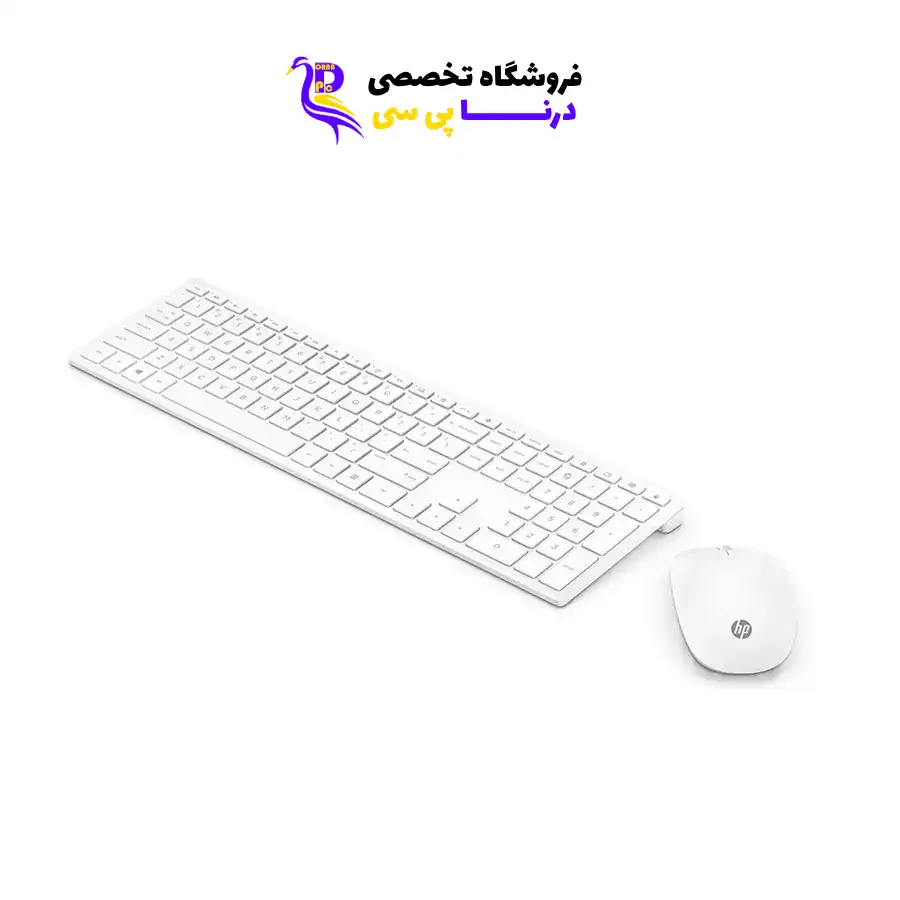 اقلام همراه:کیبورد و ماوس بدون سیم سفید رنگ HP با برد ۱۰ متر – آداپتور و کابل برق